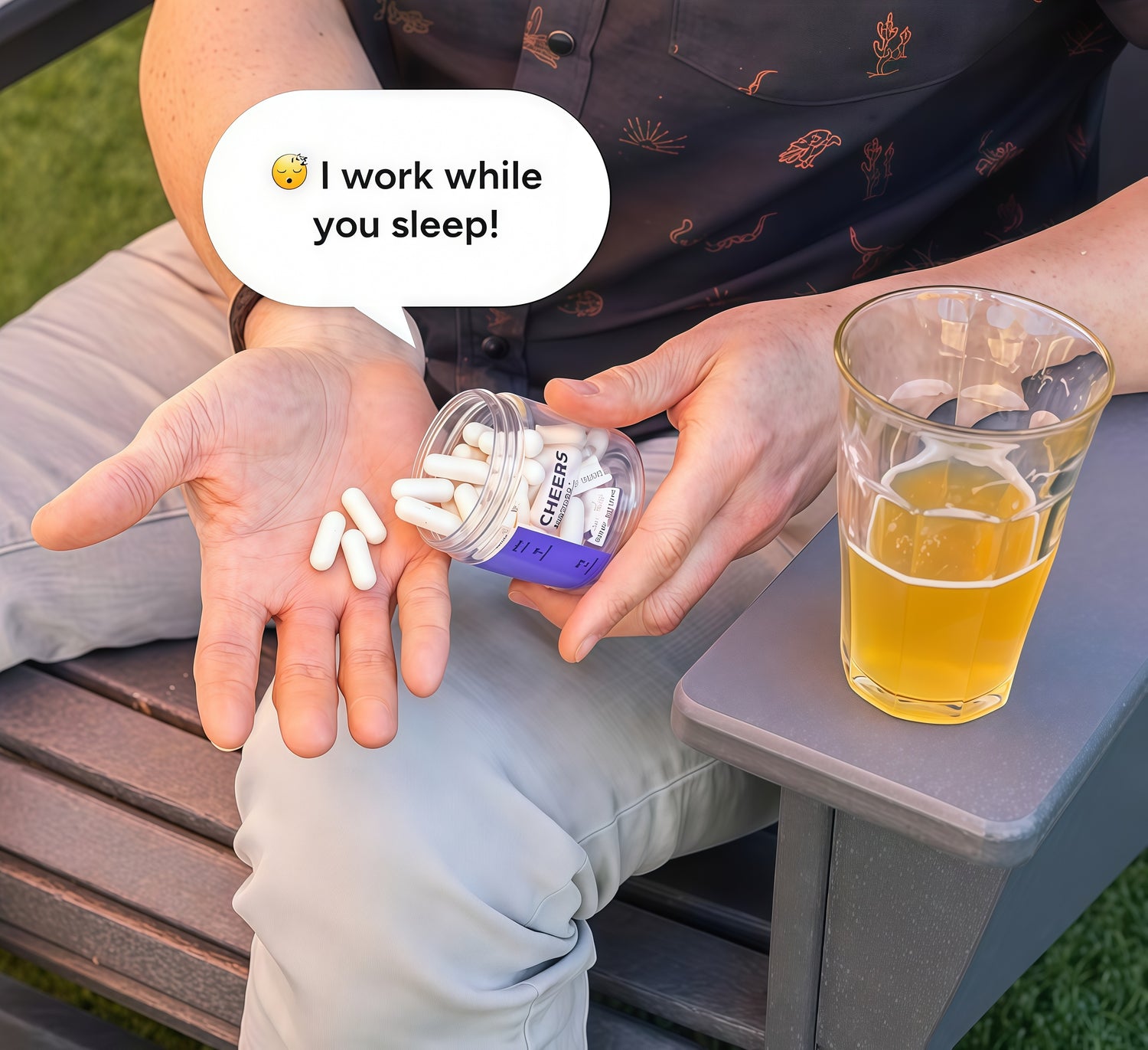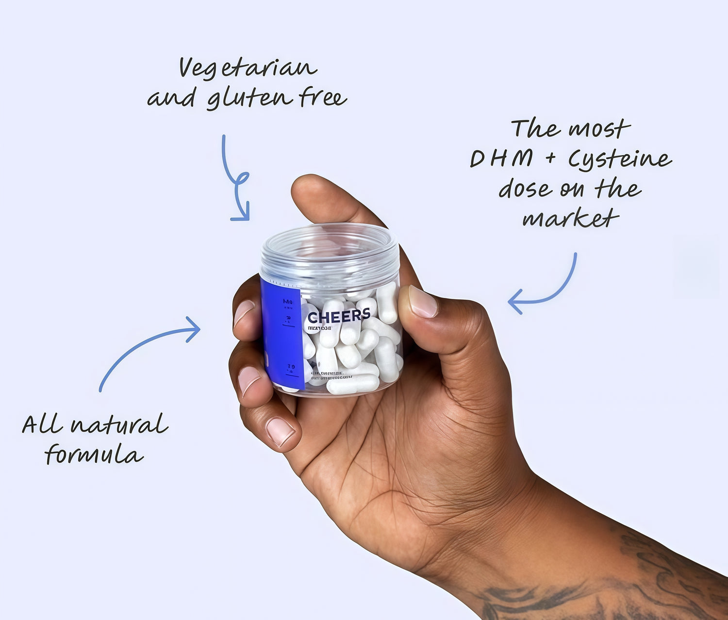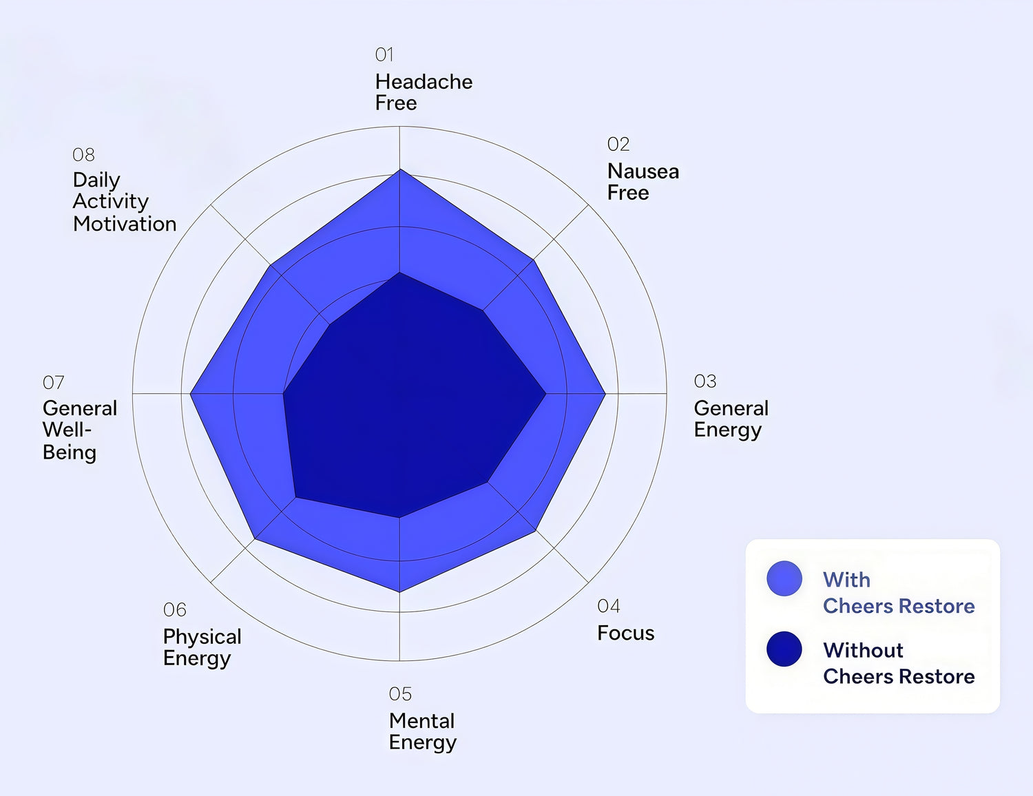 In a human study conducted for our grantedpatent, users of Cheers Restore felt an average of50%+ better the next day across 8 typical effects.Wake up feeling 50% better or your money back!