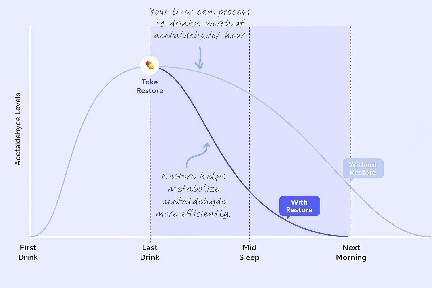 To metabolize alcohol, your body must firstconvert alcohol into acetaldehyde (20x more toxicthan alcohol itself) before clearing it from yoursystem. Restore reduces the time you're exposedto acetaldehyde, helping to speed up themetabolization process.