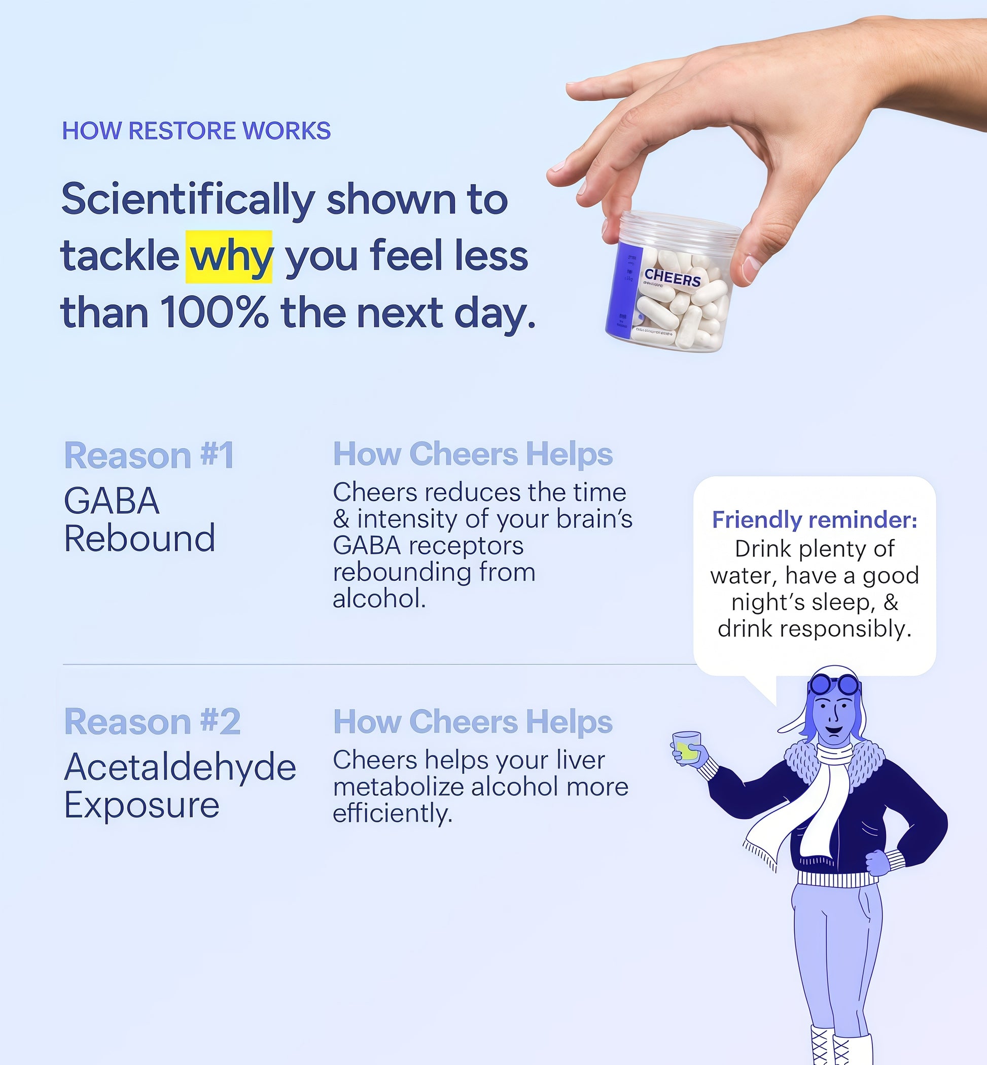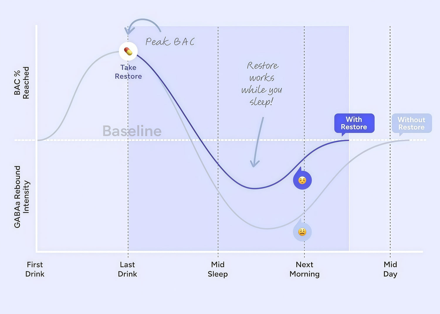Alcohol binds to your brain's GABA receptors,making you feel relaxed. When you stop drinking,your GABA receptors go into withdrawal, causingyou to feel anxious & irritable. Restore works whileyou sleep to reduce the GABA rebound, andultimately your relative time & level of discomfort.